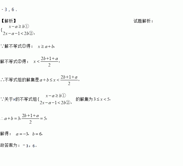 已知关于x的不等式组的解集为3≤x<5,则a= ,b= .