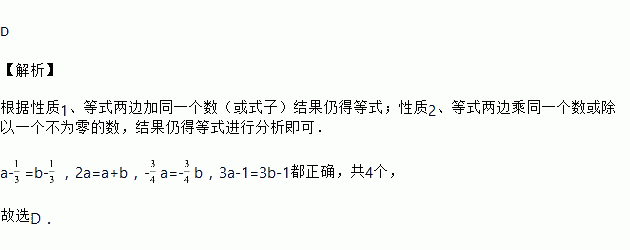 若a=b,则在a-=b-,2a=a+b,-a=-b,3a-1=3b-1中,正确的有( )