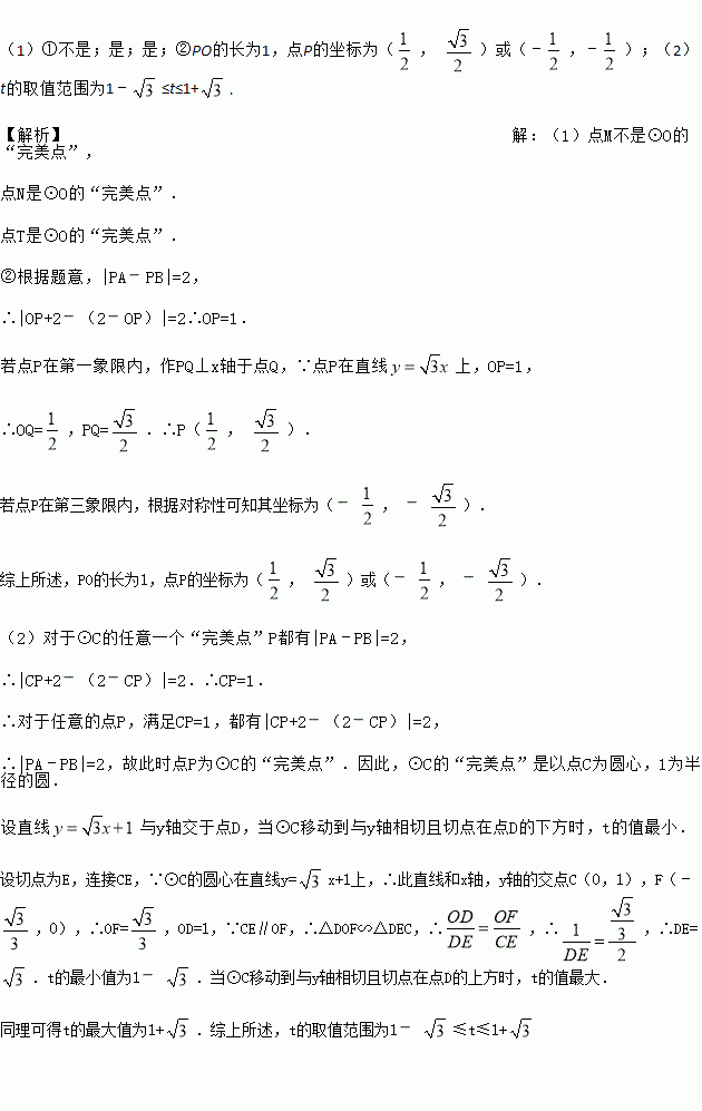 ,0)____⊙O的“完美点”,点N(0,1)_____⊙O的“完美点”,点T(﹣