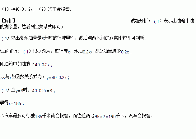 (2)设景德镇到骛源两地的里程约为95 千米,当油箱中余油量少于3升时,汽车将自动报警,则这辆汽车在往返途中是否会报警?