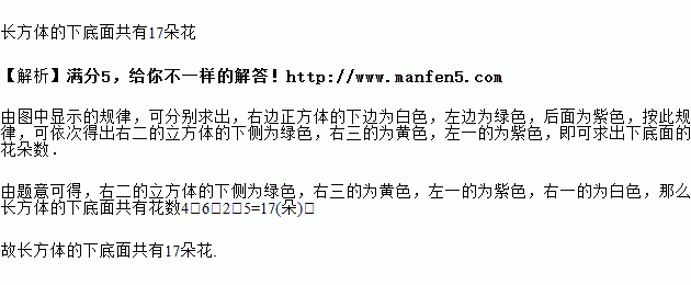 把立方体的六个面分别涂上六种不同颜色,并画上朵数不等的花,各面上的颜色与花的朵数情况见下表.现将上述大小相同,颜色、花朵分布完全一样的四个立方体拼成一个水平放置的长方体 (如图),那么该长方体的下底面共有多少朵花?