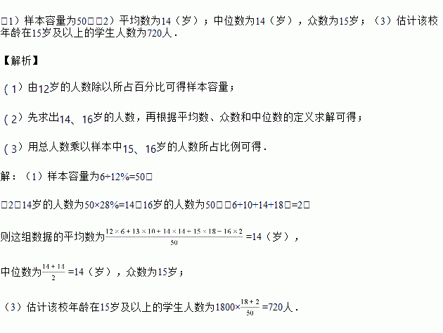 (3)若该校一共有1800名学生,估计该校年龄在15岁及以上的学生人数.