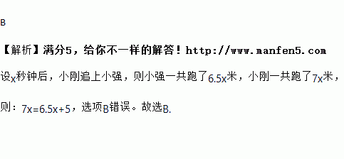 小刚、小强两人练习赛跑,小刚每秒跑7米,小强每秒跑6.5米,小刚让小强先跑5米,设x秒钟后,小刚追上小强,下列四个方程中不正确的是( )