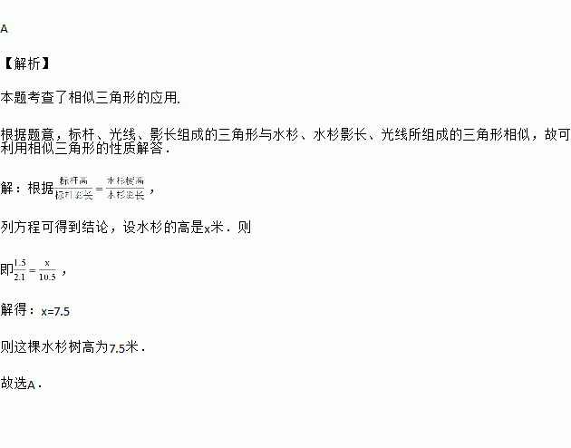 一根1.5米长的标杆直立在水平地面上,它在阳光下的影长为2.1米;此时一棵水杉树的影长为10.5米,这棵水杉树高为 ( )