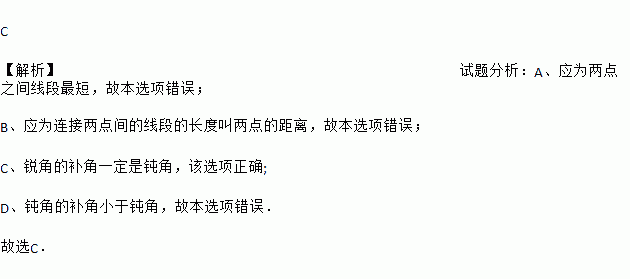 C 【解析】试题分析:A、应为两点之间线段最短,故本选项错误; B、应为连接两点间的线段的长度叫两点的距离,故本选项错误; C、锐角的补角一定是钝角,该选项正确; D、钝角的补角小于钝角,故本选项错误. 故选C.