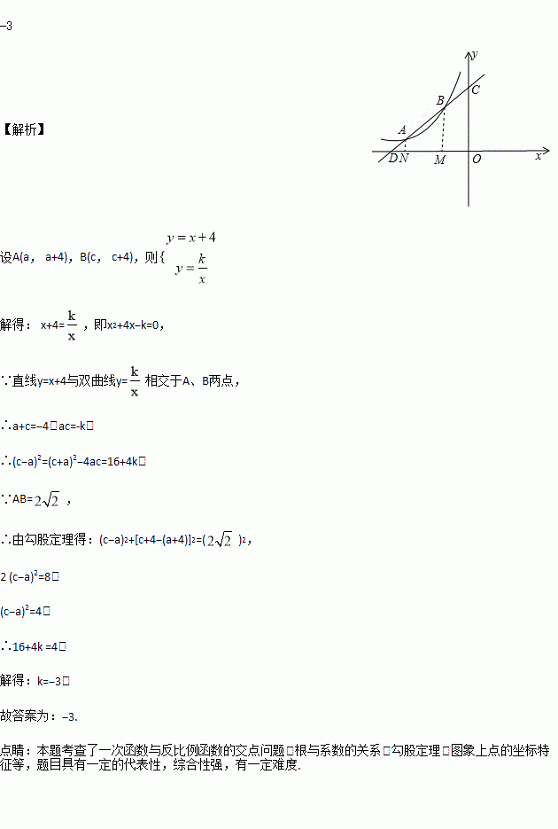 如图,已知直线y=x+4与双曲线y=(x<0)相交于A、B两点,与x轴、y轴分别相交于D、C两点,若AB=,则k=________.