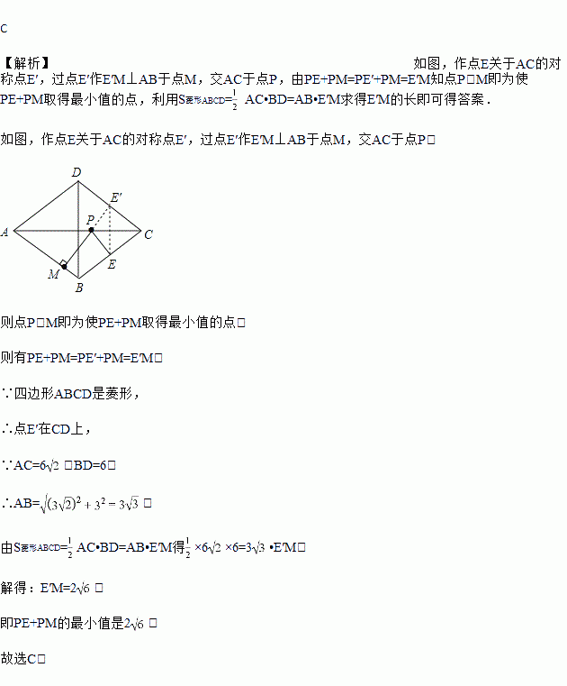如图,在菱形ABCD中,AC=6,BD=6,E是BC边的中点,P,M分别是AC,AB上的动点,连接PE,PM,则PE+PM的最小值是( )