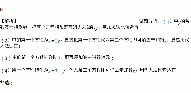 C. (2)(3)用代入法,(1)(4)用加减法 D. (2)(4)用代入法,(1)(3)用加减法