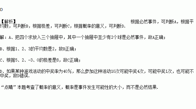 D. 如果某种游戏活动的中奖率为40%,那么参加这种活动10次不一定有4次中奖