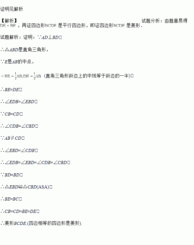 已知:如图,在梯形ABCD中,AB∥CD,BC=CD,AD⊥BD,E为AB中点,求证:四边形BCDE是菱形.