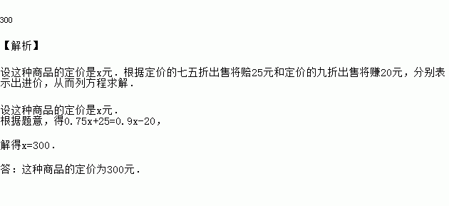 某种商品因换季准备打折出售,如果按定价的七五折出售将赔25元,而按定价的九折出售将赚20元,则商品的定价是______元
