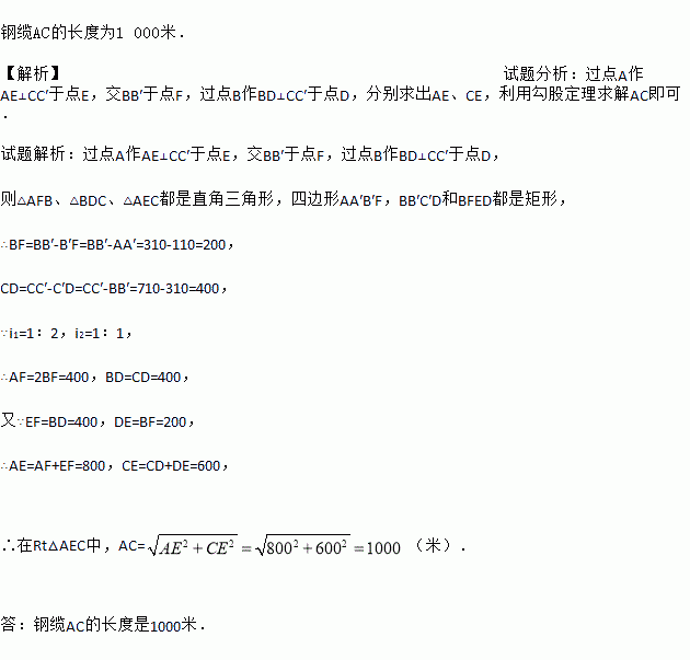 如图,点A,B,C表示某旅游景区三个缆车站的位置,线段AB,BC表示连接缆车站的钢缆,已知A,B,C三点在同一铅直平面内,它们的海拔高度AA′,BB′,CC′分别为110米,310米,710米,钢缆AB的坡度i1=1∶2,钢缆BC的坡度i2=1∶1,景区因改造缆车线路,需要从A到C直线架设一条钢缆,那么钢缆AC的长度是多少米?(注:坡度i是指坡面的铅直高度与水平宽度的比)