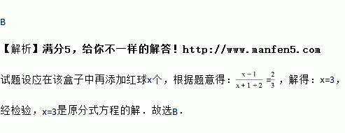 在一个不透明的盒子中,装有2个白球和1个红球,这些球除颜色外其余都相同.搅匀后从中任意摸出一个球,要使摸出红球的概率为,应在该盒子中再添加红球( )
