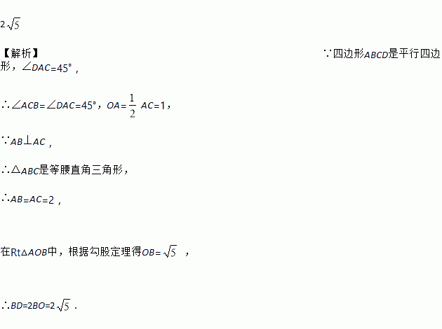 如图所示,在□ABCD中,AC与BD相交于点O,AB⊥AC,∠DAC=45°,AC=2,则BD的长是_______.