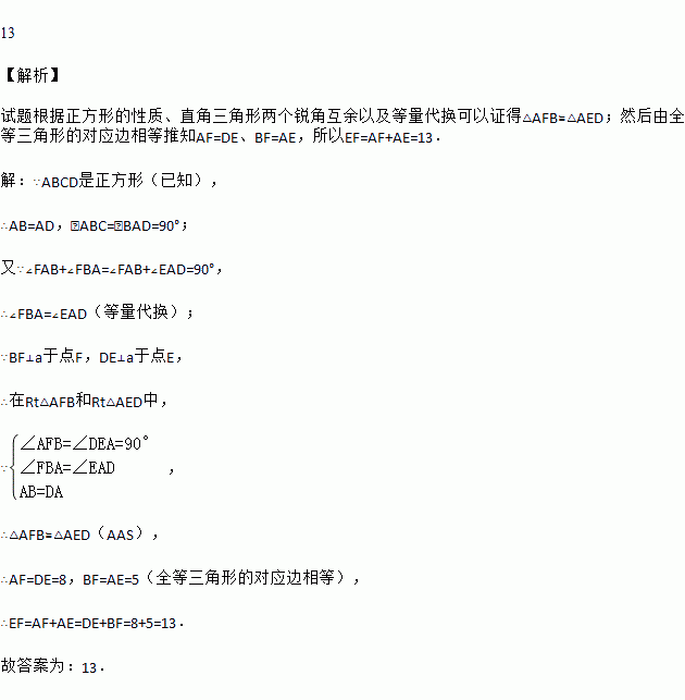 如图所示,直线a经过正方形ABCD的顶点A,分别过此正方形的顶点B,D作BF⊥a于点F,DE⊥a于点E,若DE=8,BF=5,则EF的长为____.