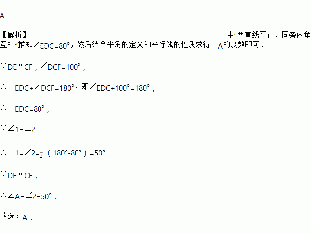 如图,一束光线从点C出发,经过平面镜 AB 反射后,沿与 AF 平行的线段 DE 射出(此时∠1=∠2),若测得 ∠DCF=100°,则 ∠A= ( )