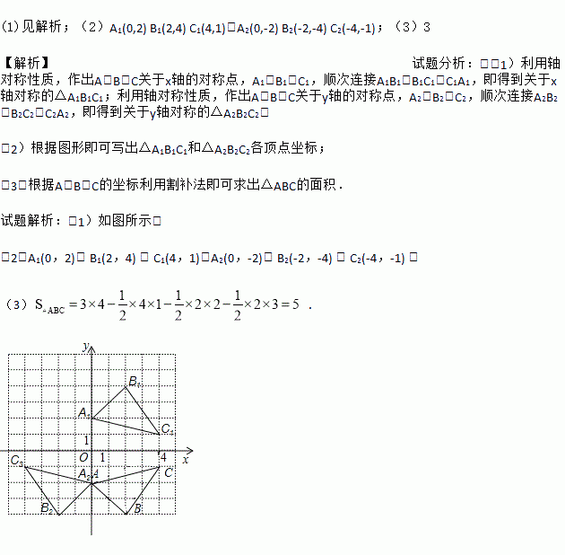 (1)分别画出与△ABC关于x轴、y轴对称的图形△A1B1C1和△A2B2C2;