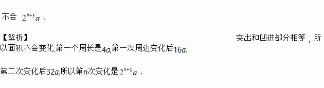 在某多媒体电子杂志的某一期上刊登了“正方形雪花图案的形成”的演示案例:作一个正方形,设每边长为4a,将每边四等分,作一凸一凹的两个边长为a的小正方形,得到图形如图(2)所示,称为第一次变化,再对图(2)的每个边做相同的变化,得到图形如图(3),称为第二次变化.如此连续作几次,便可得到一个绚丽多彩的雪花图案.如不断发展下去到第n次变化时,图形的面积是否会变化,________(填写“会”或者“不会”),图形的周长为__________.