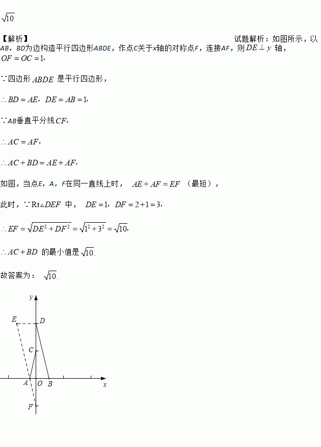 如图,长为1的线段AB在x轴上移动C(0,1)、D(0,2),则AC+BD的最小值是_____.