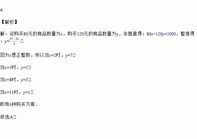 “双11”促销活动中,小芳的妈妈计划用1000元在某购物网站购买价格分别为80元和120元的两种商品,则可供小芳妈妈选择的购买方案有( )