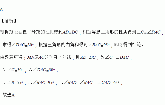 AC的长为半径画弧,两弧相交于点M,N,作直线MN,交BC于点D,连接AD,则∠BAD的度数为( )