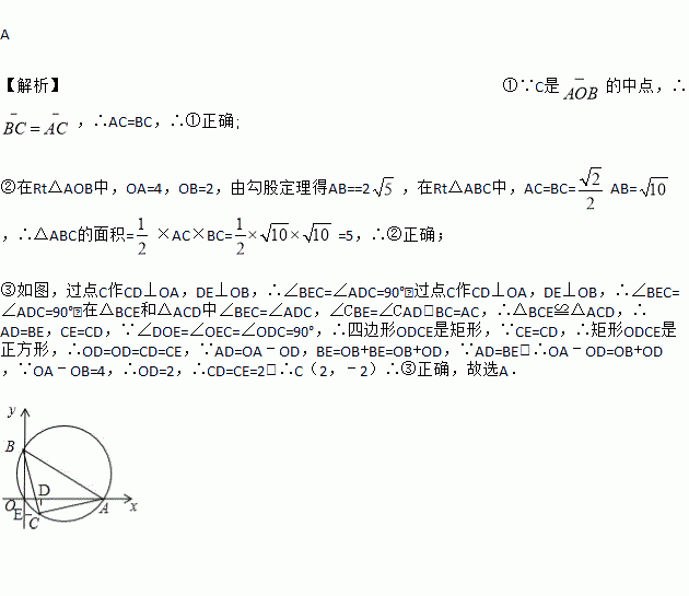 的中点,连结AC,BC.下列结论:①AC=BC;②若OA=4,OB=2,则△ABC的面积等于5;③若OA﹣OB=4,则点C的坐标是(2,﹣2).其中正确的结论有( )