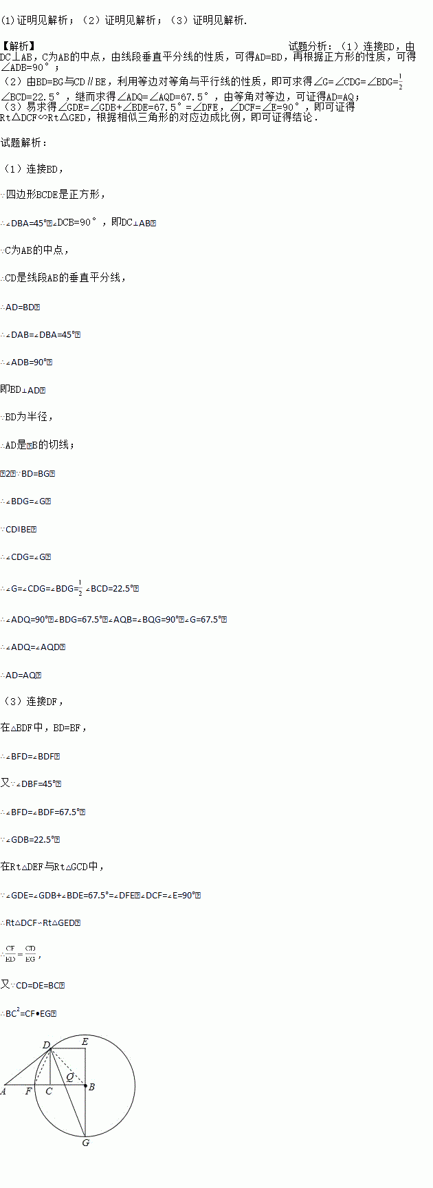 求证:(1)AD是⊙B的切线;(2)AD=AQ;(3)BC2=CF•EG.