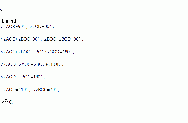 C 【解析】∵∠AOB=90°,∠COD=90°, ∴∠AOC+∠BOC=90°,∠BOC+∠BOD=90°, ∴∠AOC+∠BOC+∠BOC+∠BOD=180°, ∵∠AOD=∠AOC+∠BOC+∠BOD, ∴∠AOD+∠BOC=180°, ∵∠AOD=110°,∴∠BOC=70°, 故选C.