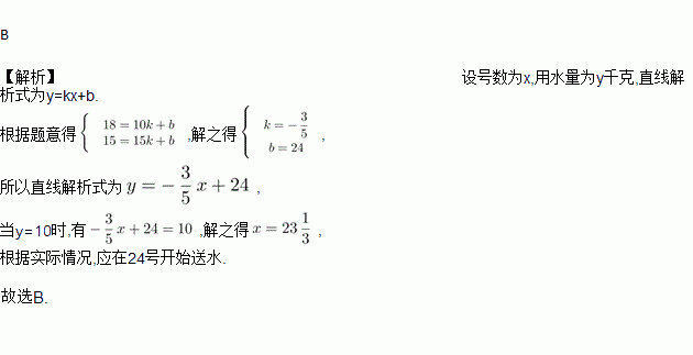2006年的夏天,某地旱情严重.该地10号,15号的人日均用水量的变化情况如图所示.若该地10号,15号的人均用水量分别为18千克和15千克,并一直按此趋势直线下降.当人日均用水量低于10千克时,政府将向当地居民送水.那么政府应开始送水的号数为( )