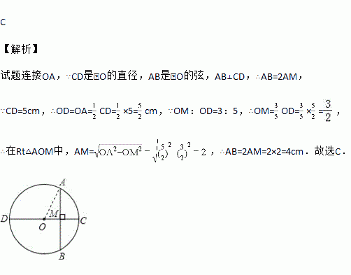 如图,⊙O的直径CD=5cm,AB是⊙O的弦,AB⊥CD,垂足为M,OM:OD=3:5,则AB 的长是( )