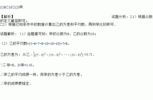 (2)已知通过计算器求得=8,≈1.43,试比较甲、乙两人谁的成绩更稳定?