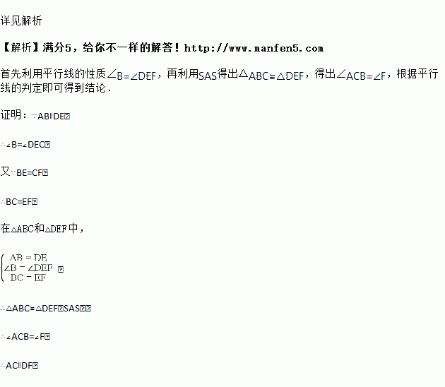 已知:如图,AB=DE,AB∥DE,BE=CF,且点B、E、C、F都在一条直线上,求证:AC∥DF.