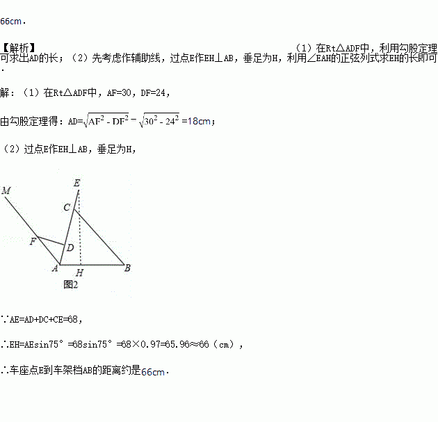 为给人们的生活带来方便,2017年兴化市准备在部分城区实施公共自行车免费服务.图1是公共自行车的实物图,图2是公共自行车的车架示意图,点A、D、C、E在同一条直线上,CD=35cm,DF=24cm,AF=30cm,FD⊥AE于点D,座杆CE=15cm,且∠EAB=75°.