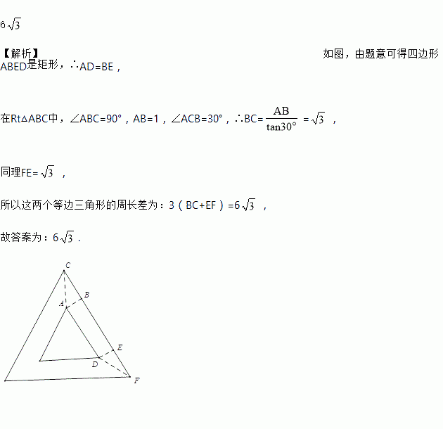 将一个三角形经过放大后得到另一个三角形,如果所得三角形在原三角形的外部,这两个三角形各对应边平行且距离都相等,那么我们把这样的两个三角形叫做“等距三角形”,它们对应边之间的距离叫做“等距”.如果两个等边三角形是“等距三角形”,它们的“等距”是1,那么它们周长的差是_____.