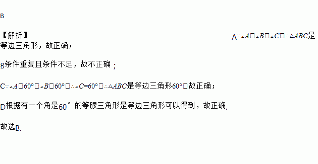 D. ∵AB=AC,∠B=60°,∴△ABC是等边三角形