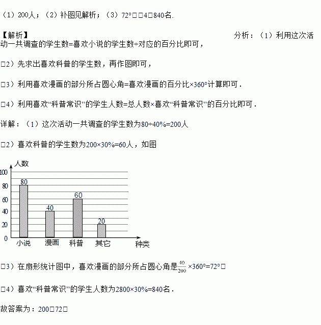 (4)若七年级共有学生2800人,请你估计喜欢“科普常识”的学生人数共有多少名?