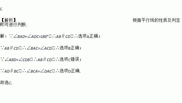 C 【解析】根据平行线的性质及判定即可进行判断. 【解析】 ∵∠BAD+∠ADC=180°,∴AB∥CD,∴选项A正确; ∵AB∥CD,∴∠BAC=∠ACD,∴选项B正确; ∵∠ABD=∠CDB,∴AB∥CD,∴选项C错误; ∵AD∥BC,∴∠BCA=∠DAC,∴选项D正确. 故选C.