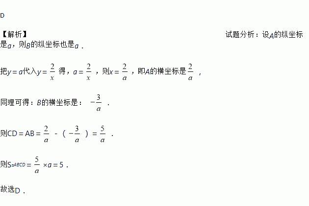 D ¡¾½âÎö¡¿ÊÔÌâ·ÖÎö£ºÉèAµÄ×Ý×ø±êÊÇa£¬ÔòBµÄ×Ý×ø±êÒ²ÊÇa£® °Ñy£½a´úÈëy£½µÃ£¬a£½£¬Ôòx£½£¬¼´AµÄºá×ø±êÊÇ£¬ ͬÀí¿ÉµÃ£ºBµÄºá×ø±êÊÇ£º £® ÔòCD£½AB£½££¨£©£½£® ÔòS¡õABCD£½¡Áa£½5£® ¹ÊÑ¡D£®