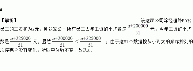 A 【解析】设这家公司除经理外50名员工的工资和为a元,则这家公司所有员工去年工资的平均数是元,今年工资的平均数是元,显然< ;由于这51个数据按从小到大的顺序排列的次序完全没有变化,所以中位数不变.故选A.