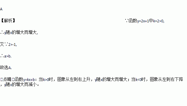 已知点(2,a)、(-1,b)都在直线y=2x+1上,则a与b的大小关系是 ( )