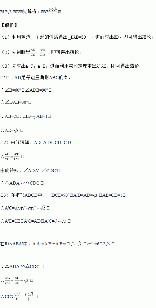 如图,等边△ABC中,AB=2,AD⊥BC,以AD、CD为邻边做矩形ADCE,将△ADC绕点D顺时针旋转一定的角度得到△A′DC′使点A′落在CE上,连接AA′,CC′.