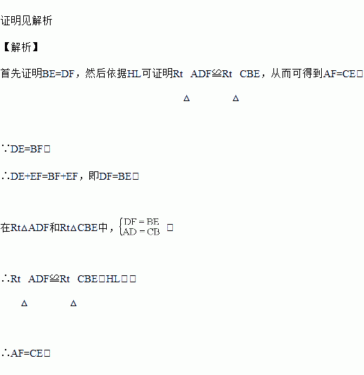 如图,点E、F在线段BD上,AF⊥BD,CE⊥BD,AD=CB,DE=BF,求证:AF=CE.