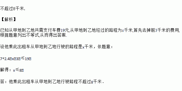 某城市出租车的收费标准是:起步价7元(即行驶距离不超过3千米都需付7元车费),超过3千米,每增加1千米,加收2元(不足1千米按1千米).某人乘这种出租车从甲地到乙地共付车费19元,那么他乘此出租车从甲地到乙地行驶的距离不超过多少千米?