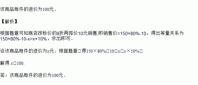 某商品每件标价为150元,若按标价打8折后再降价10元销售,仍获利10%,则该商品每件的进价为多少元?