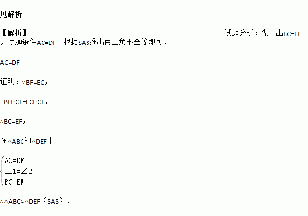 如图,点C,F在线段BE上,BF=EC,∠1=∠2,请你添加一个条件,使△ABC≌△DEF,并加以证明.(不再添加辅助线和字母)