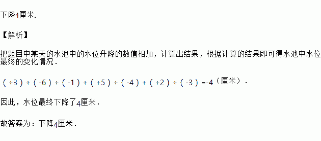 水池中的水位在某天不同时间测得记录如下(规定上升为正,单位:厘米):+3,﹣6,﹣1,+5,﹣4,+2,﹣3,那么,这天水池中水位最终的变化情况是_____