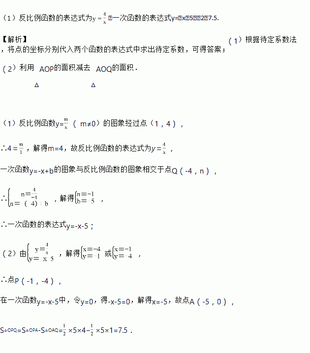 (2)一次函数的图象分别与x轴、y轴交于A、B两点,与反比例函数图象的另一个交点为P点,连结OP、OQ,求△OPQ的面积.