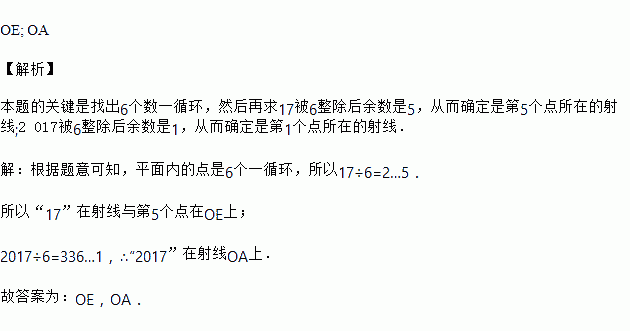 如图,平面内有共端点的六条射线OA,OB,OC,OD,OE,OF,从射线OA开始按逆时针方向依次在射线上写出数字1,2,3,4,5,6,7,…,则“17”在射线____上,“2 017”在射线____上.