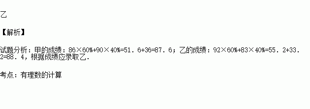 某校欲招聘一名教师,计划将面试成绩与笔试成绩按6:4计算总分并择优录取.下面是两名候选人的测试成绩,则该校应录取的是 .(填“甲”或“乙”)