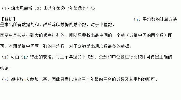 (1)填表见解析(2)①八年级②七年级③九年级 【解析】(1)平均数的计算方法是求出所有数据的和,然后除以数据的总个数.对于中位数, 因图中是按从小到大的顺序排列的,所以只要找出最中间的一个数(或最中间的两个数)即 可,本题是最中间两个数的平均数.对于众数是出现次数最多的数据; (2)可由(1)得出的表格,将三个年级的平均数,众数和中位数进行比较即可得出正确的 结论;...